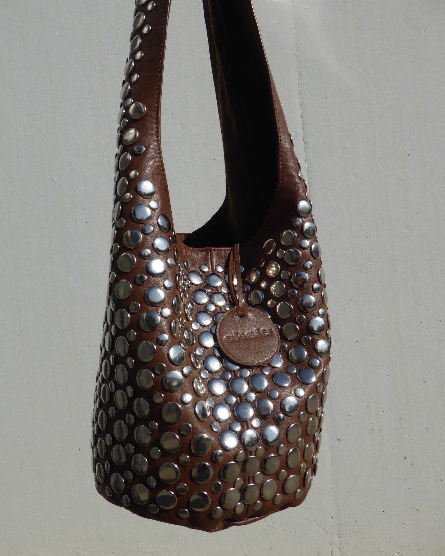 Bolso de piel marrón, con forro de ante y tachuelas de acero plateadas en dos tamaños. Cuenta con un cierre magnético principal, un bolsillo interior con cremallera y un distintivo de piel del mismo color.